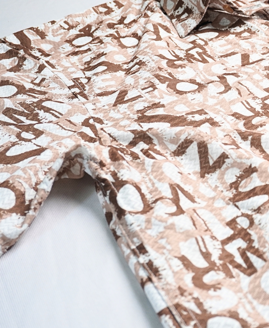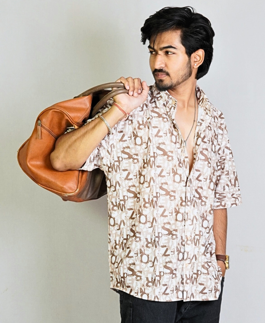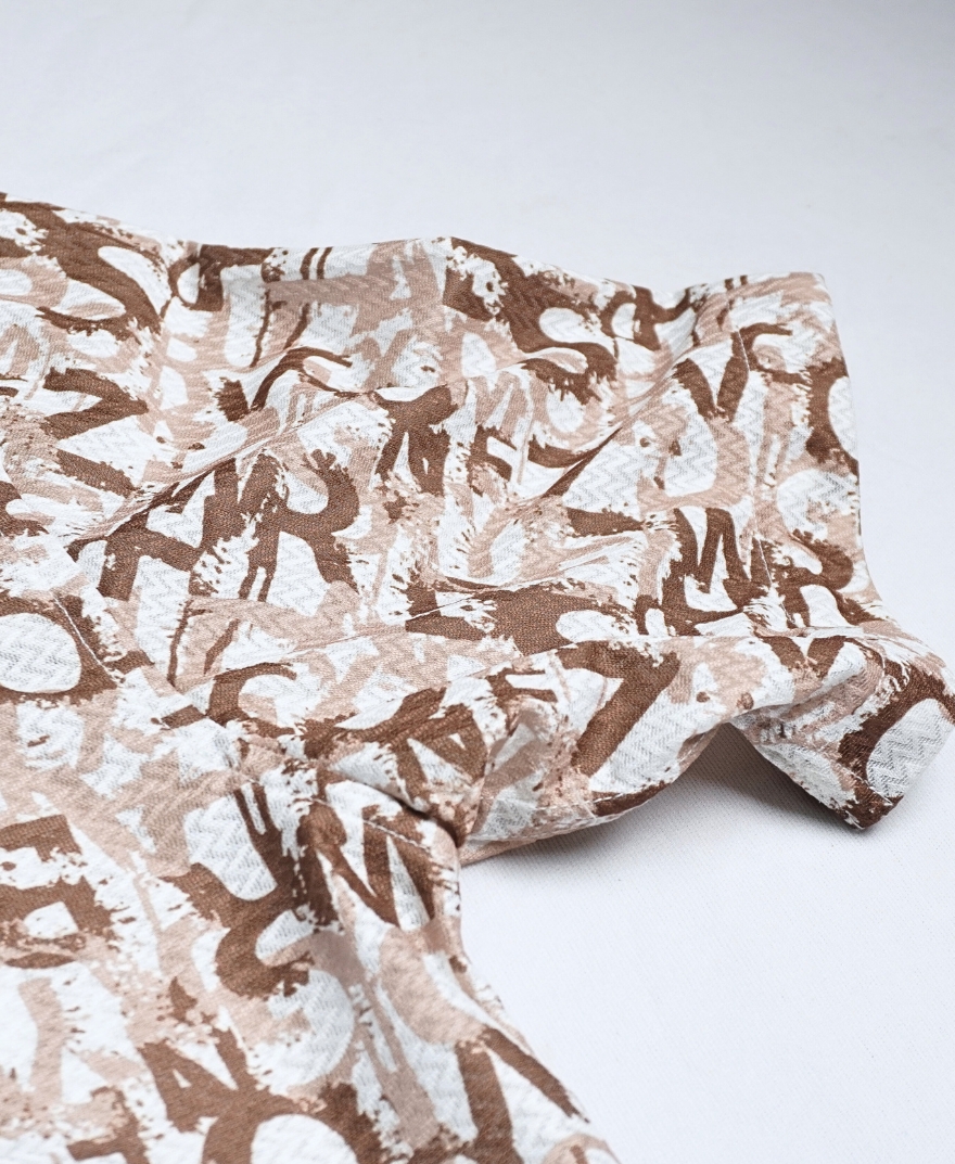 The rich brown base color adds warmth and depth, while the playful alphabet pattern brings out a retro and youthful vibe. Whether you’re dressing up for a casual hangout, heading to a café, or exploring the city, this shirt helps you stand out while staying comfortable.