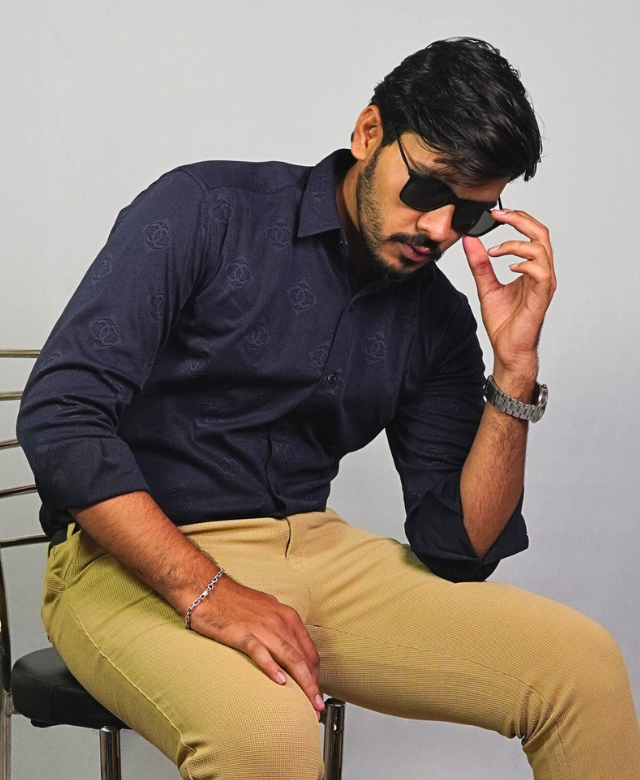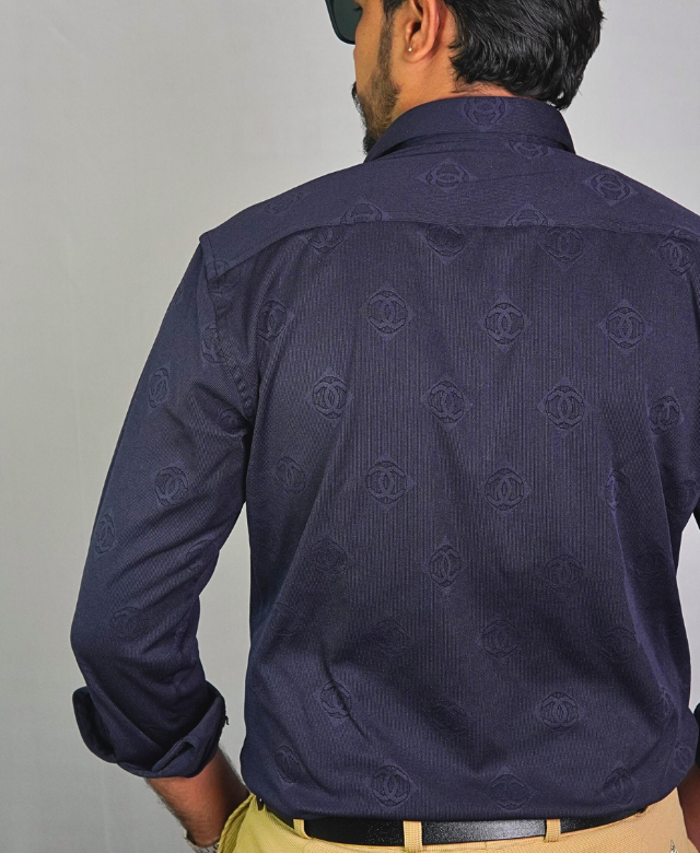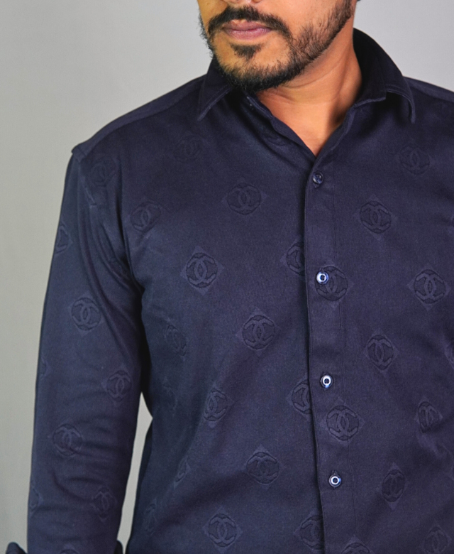 The deep navy color offers a strong and elegant vibe, perfect for pairing with both light and dark bottoms. The embossed pattern gives the shirt a subtle luxury feel, making it stand out without being flashy. It’s the ideal choice when you want to look sharp and feel great.