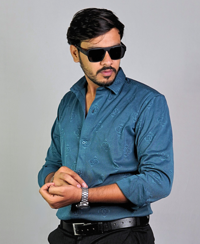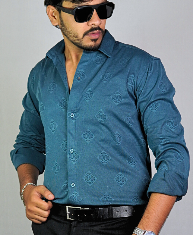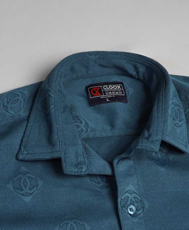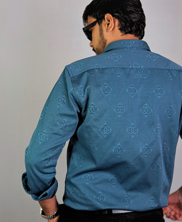 The teal blue color offers a strong and elegant vibe, perfect for pairing with both light and dark bottoms. The embossed pattern gives the shirt a subtle luxury feel, making it stand out without being flashy. It’s the ideal choice when you want to look sharp and feel great.